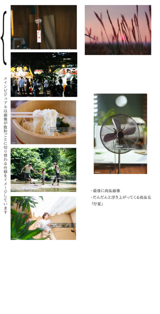 ・背景はそのシーンにあった自然の写真や動画(打ち上げ花火、風に靡く草花、木漏れ日と太陽のフレア、氷と水、畳、)