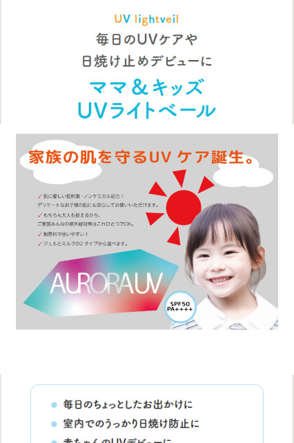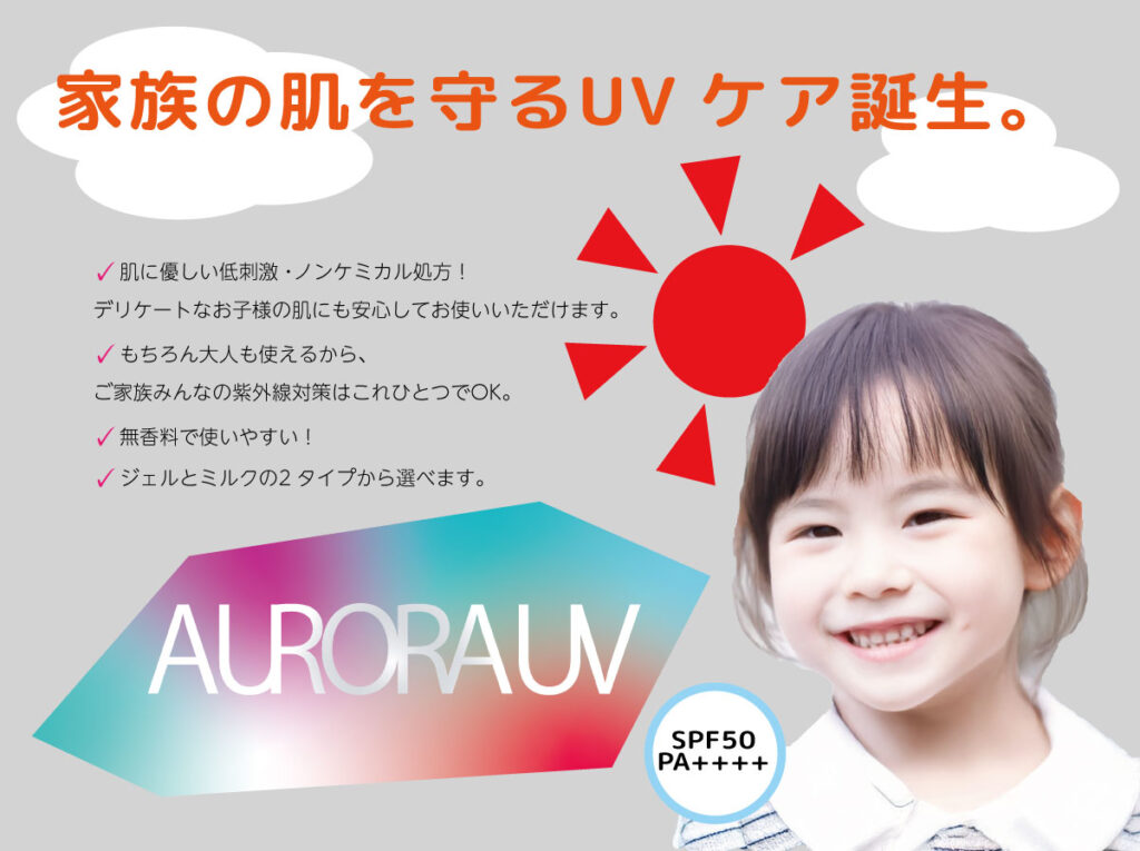 大人向けの日焼け止めブランド『AURORA UV』から子供も使える日焼け止め商品が発売された。PRバナーのためのキャッチコピーと、以下を訴求したボディコピーを3文以内で作成して。