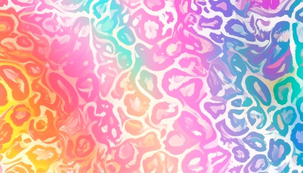 「テキスタイルデザイン 模様 シンプル 白色のヒョウ柄 背景虹色 グラデーション 薄い色 パステルカラー」