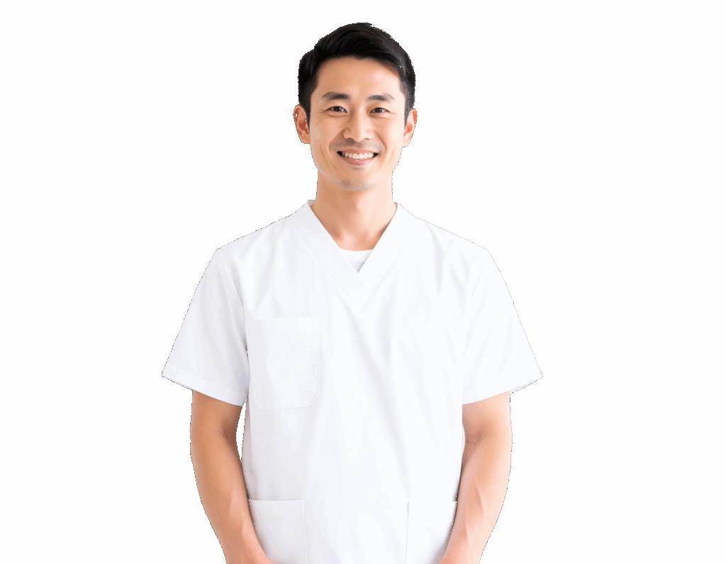 「整骨院 院長 人物写真 上半身 正面 37歳 男性 日本人 爽やか 笑顔 制服 背景透過」