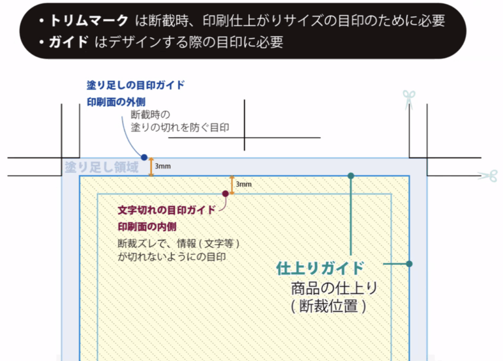 印刷物のデザインでは、断裁の際に必要になるため、トリムマークとガイド(ピクトグラムやロゴマークの作成でも使った機能・印刷には反映されないが、デザインの際に目安となる線)を入れる必要がある。