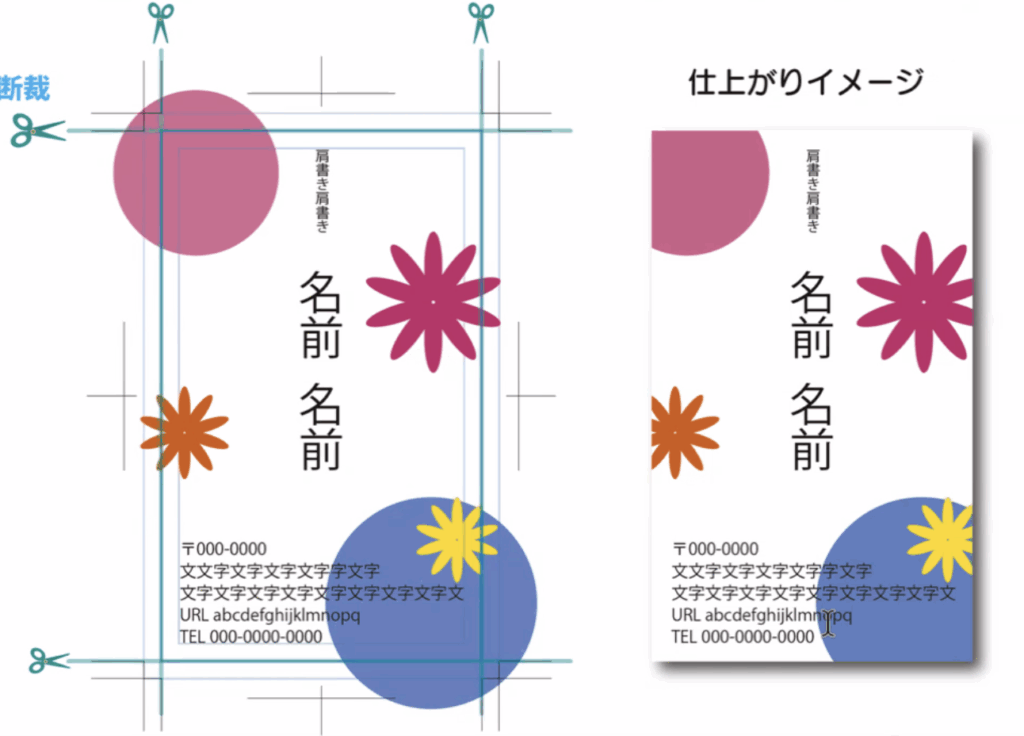 印刷物のデザインを作成する場合、背景色を裁断面の外側に数ミリ広く取らないといけない。